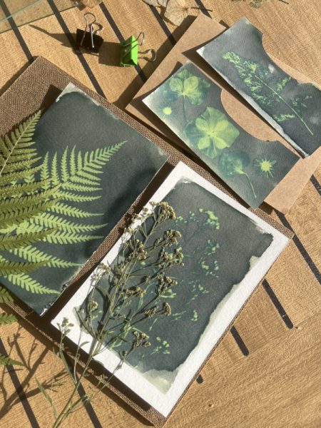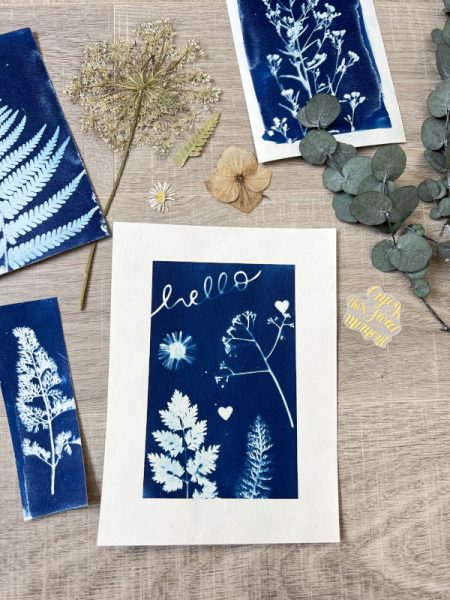 Cette technique repose sur la photosensibilité d’un mélange chimique appliqué sur du papier ou du tissu. Exposé à la lumière du soleil puis simplement rincé à l’eau, le support révèle de magnifiques empreintes aux nuances profondes de bleu de Prusse.